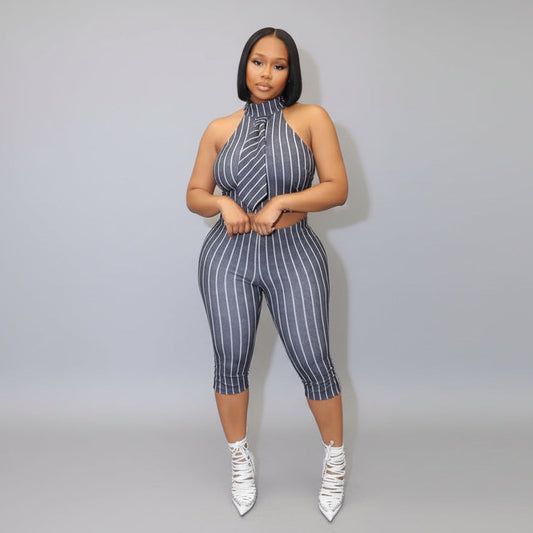 Deep V Halter Vest Cropped Pants Two Piece Set