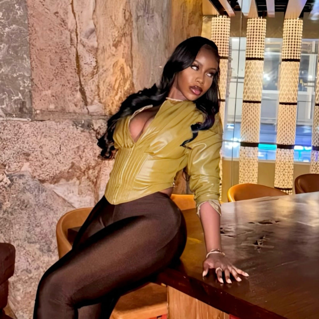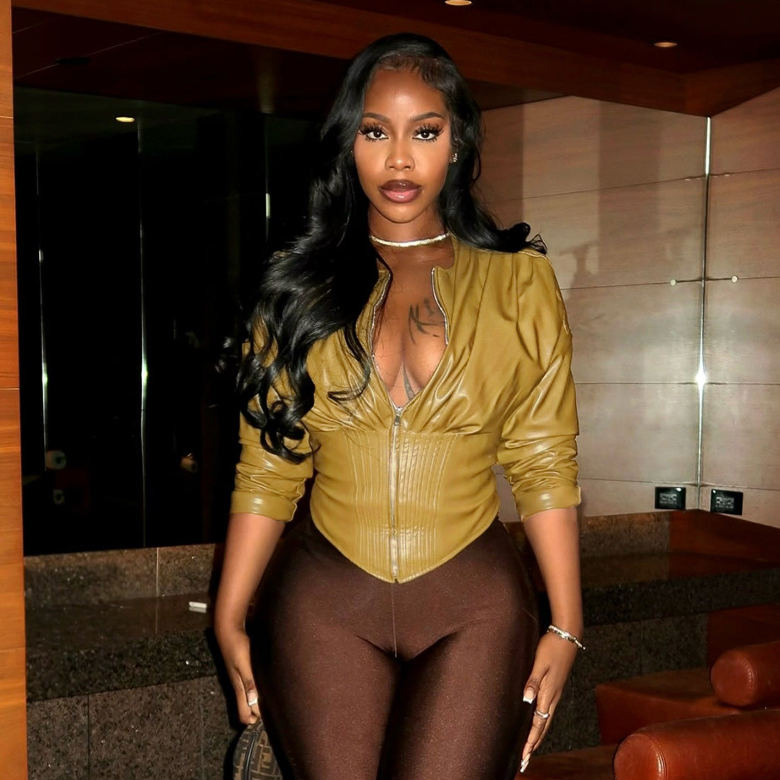Elegance meets modern practicality in the Long Sleeve Zipper Round-Neck Faux Leather Solid-Color Pleated Slim Short Coat. Crafted from premium faux leather over a durable polyester backing, it offers a refined hand and dependable shape retention without the weight of genuine leather. The slim silhouette, round neckline, and short coat length enable effortless layering—over a cashmere knit, a silk blouse, or a tailored dress—while a concealed zipper preserves clean, uninterrupted lines. Subtle ruching and pleated details introduce quiet texture, signaling craft without excess.