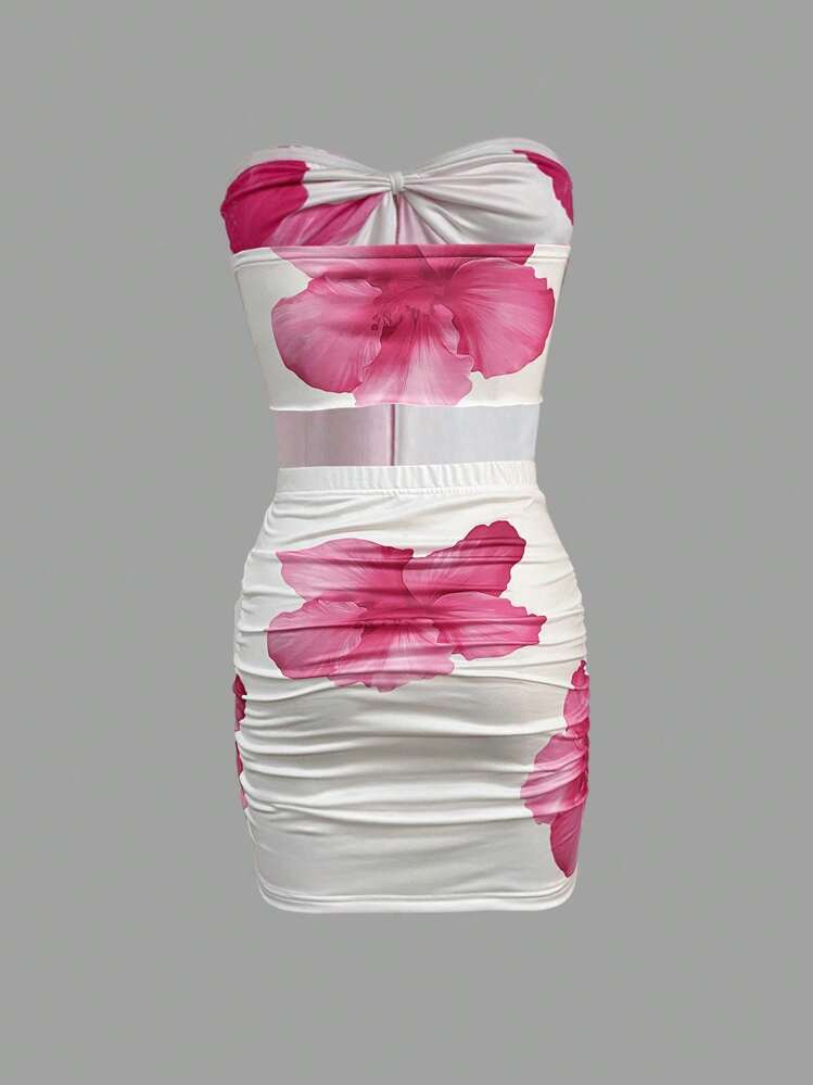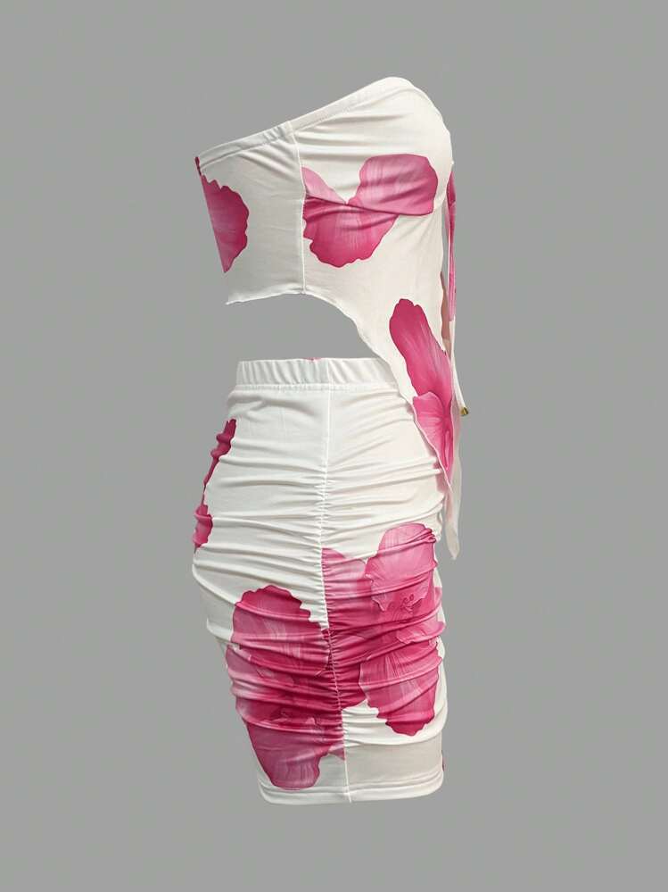 Summer Women Sexy Print Lace up off Shoulder Tube Top Package Hip Slim Fit Skirt Two Piece Sets